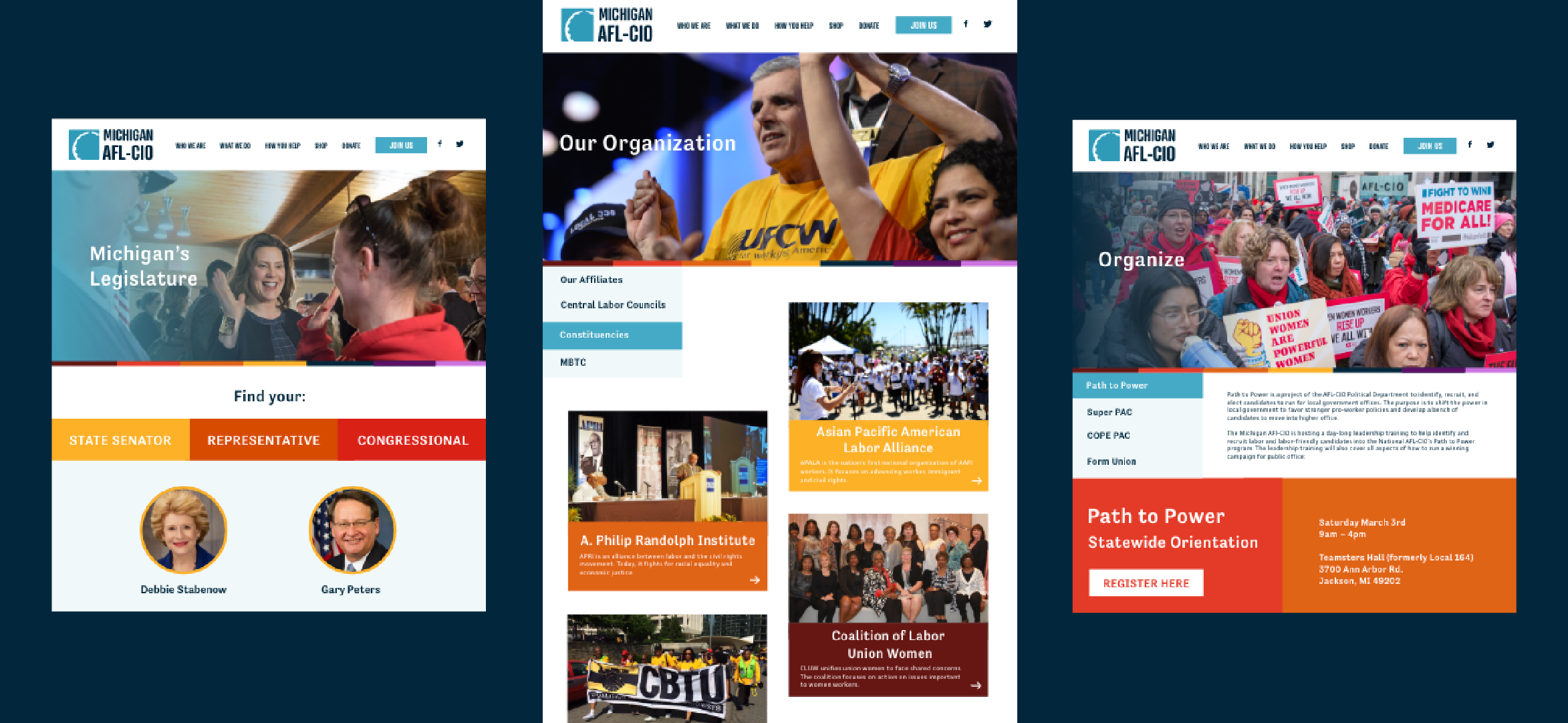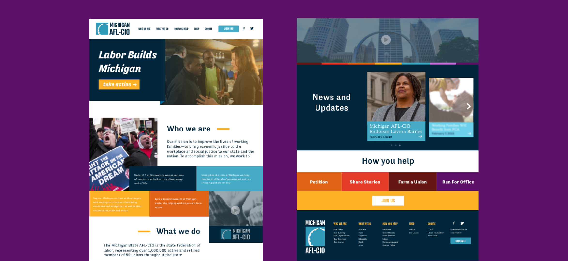The Michigan AFL-CIO works with affiliates and community partners to create economic stability, grow the labor movement and rewrite the rules in favor of working families. My colleague created the new branding, while I implemented and brought it to life on the website, taking the opportunity to inject some vibrancy into the updated website. Both the brand and website feature prominently the shape of the Labor Legacy Monument in Detroit, a monument that celebrates the state’s contributions to the labor movement.